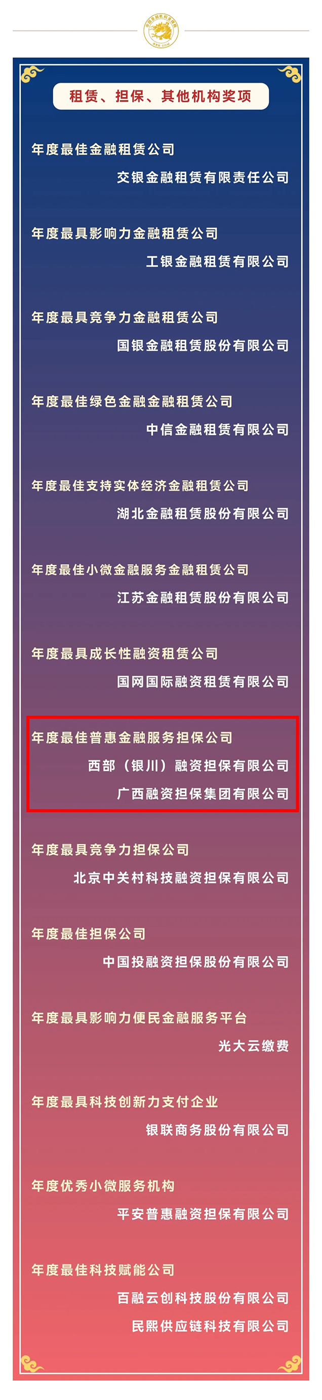 12月15日,2021“中國(guó)金融機(jī)構(gòu)金牌榜·金龍獎(jiǎng) ”重磅揭曉!西部(銀川)融資擔(dān)保有限公司憑借服務(wù)實(shí)體的成果表現(xiàn)、專業(yè)創(chuàng)新的經(jīng)營(yíng)理念,以及業(yè)界良好的品牌影響力,梅開(kāi)二度,斬獲“年度最佳普惠金融服務(wù)擔(dān)保公司”,這是繼2020年榮膺該獎(jiǎng)項(xiàng)后,西部擔(dān)保再次獲此殊榮。