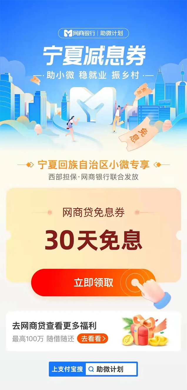 活動(dòng)期間, 寧夏自治區(qū)范圍內(nèi)小微工商戶、特色產(chǎn)業(yè)農(nóng)戶無(wú)需出門(mén),在支付寶搜索「助微計(jì)劃」,進(jìn)入城市減息券板塊,領(lǐng)取寧夏減息券,通過(guò)綜合信用評(píng)估后,即可降低利率,或獲得30天的貸款免息券。