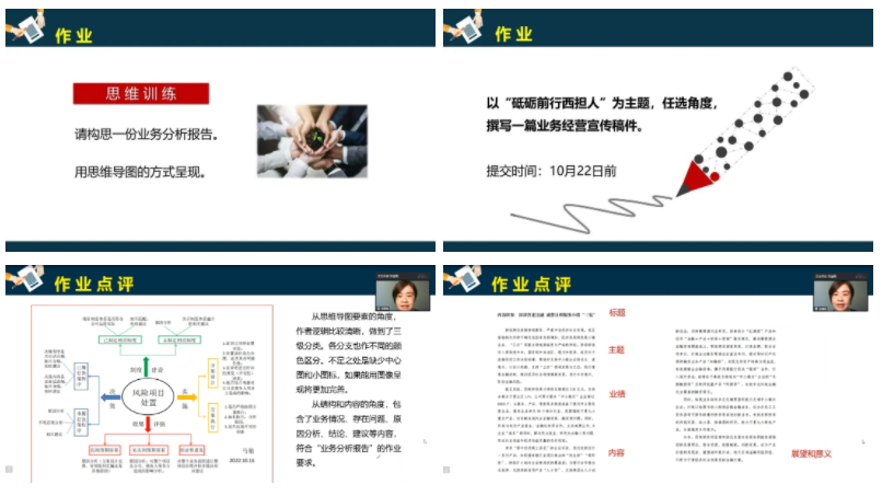 為更好的鞏固學(xué)習(xí)內(nèi)容,張老師在三次直播課的間隙為學(xué)員布置課后作業(yè)進(jìn)行專(zhuān)項(xiàng)訓(xùn)練:一是設(shè)計(jì)思維導(dǎo)圖,培養(yǎng)學(xué)員養(yǎng)成“凡事向下想三層”的習(xí)慣,不斷自我雕刻;二是撰寫(xiě)宣傳稿件,鍛煉學(xué)員從“作者邏輯”切換到“讀者邏輯”的寫(xiě)作思維。參訓(xùn)學(xué)員積極配合,共提交作業(yè)56份,其中馬艷、楊京晶的作業(yè)被評(píng)為“優(yōu)秀”。參訓(xùn)學(xué)員紛紛表示,此次公文寫(xiě)作培訓(xùn)內(nèi)容專(zhuān)業(yè)豐富、實(shí)用性強(qiáng)。