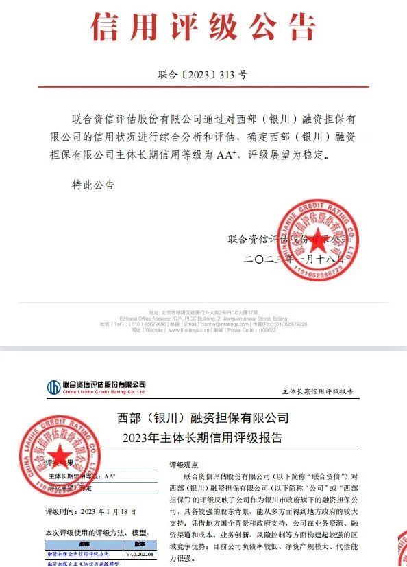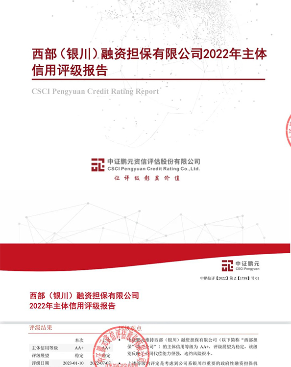 近日,國內(nèi)權(quán)威信用評級機構(gòu)中證鵬元資信評估股份有限公司、聯(lián)合資信評估股份有限公司相繼完成了對西部擔保2022年度主體信用評級續(xù)評工作,維持主體信用等級為“AA+”、評級展望為“穩(wěn)定”。